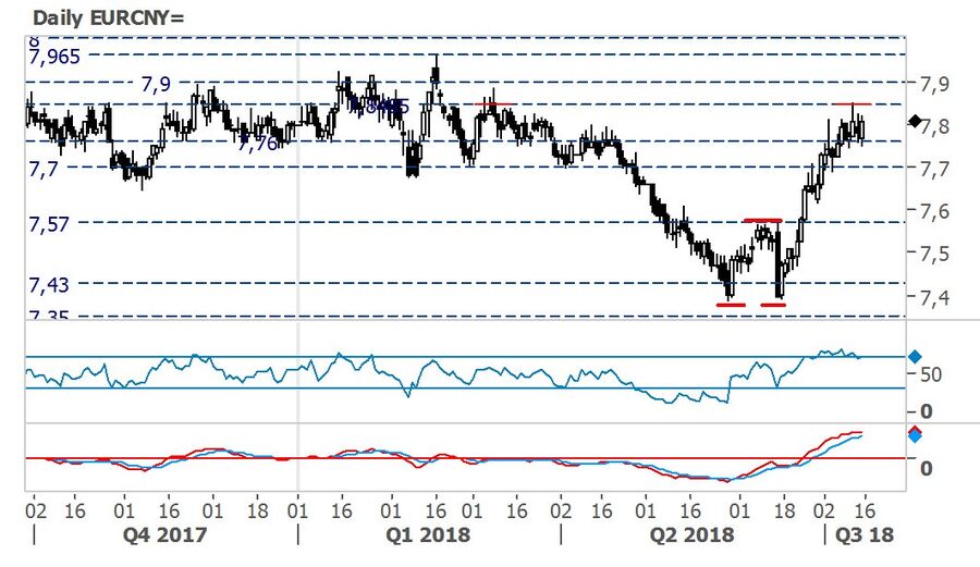 Numa perspetiva técnica, em meados de junho de 2016, o Eur/Cny deu sinais de possibilidade de um duplo fundo, o qual acabou por se comprovar e elevar o par a níveis próximos dos 7.85 yuans. O MACD permanece com sinal de compra, mas poderá estar prestes a ver as suas médias móveis a convergir, à medida que o par negoceia em overbought e próximo de níveis de resistência de grande relevância. Apesar de a tendência no curto-prazo permanecer ascendente, a possibilidade de uma correção em baixa é cada vez maior.