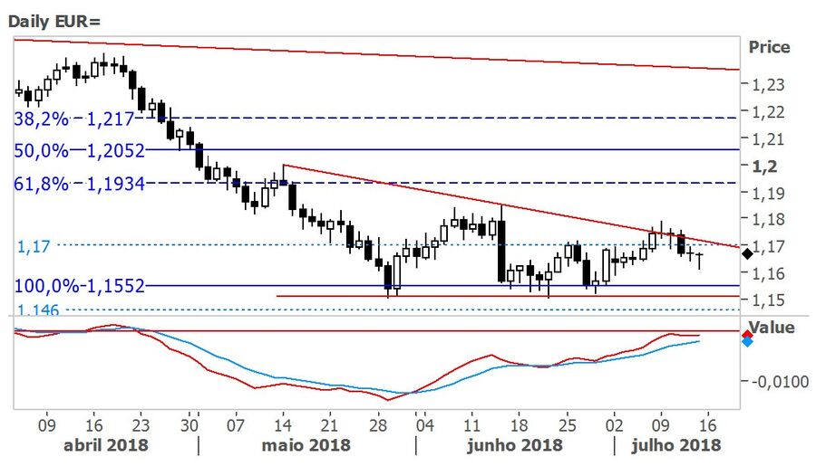 Tecnicamente, o Eur/Usd chegou a negociar acima do limite superior do triângulo descendente – formação que indica continuidade da tendência –, mas acabou por recuar novamente, comprovando a recente fragilidade em níveis acima dos $1.1700. O par tem vindo a registar máximos relativos cada vez menores, demonstrando uma compressão do preço, indicando que a tendência poderá se definir melhor brevemente.