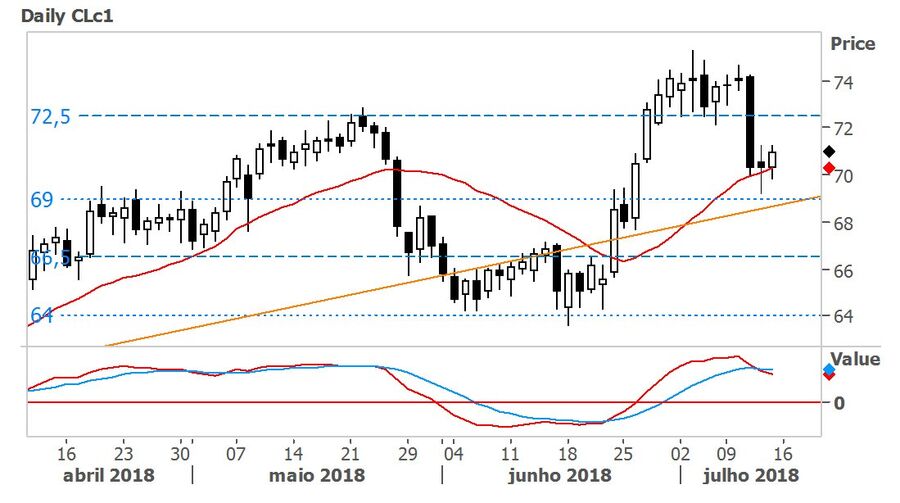 Tecnicamente, o MACD, após a queda registada na quarta-feira reverteu o sinal, tendo as suas médias móveis convergido e iniciado um sinal de venda. Já era expectável uma correção em baixa do crude, tendo em conta que ele negociava em overbought desde finais de junho. O suporte fixa-se na zona dos $69 e na linha de tendência ascendente.