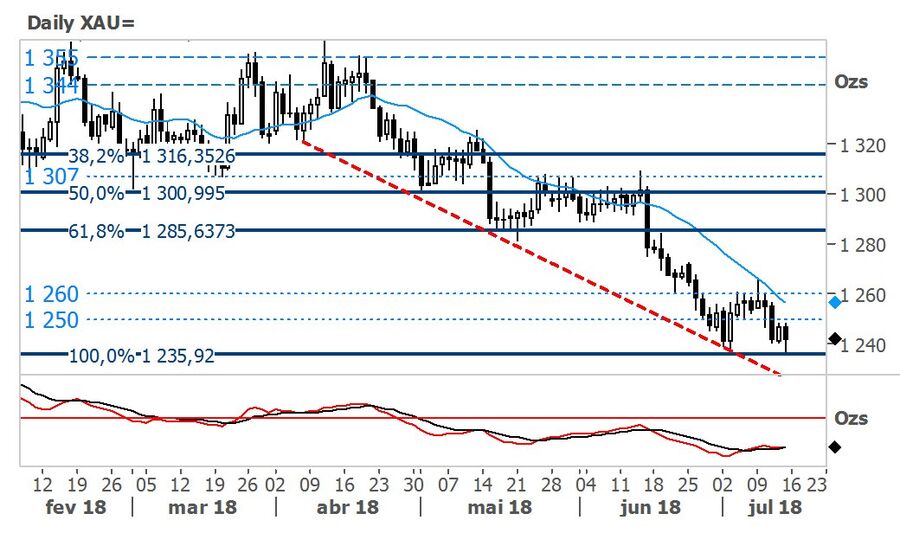 O preço do ouro tem vindo a cair testando os $1240, pressionado pelos ganhos do dólar face ao iene, devido à nova escalada da guerra comercial. O metal precioso continua a não ser visto pelos investidores como um ativo seguro, nos recentes momentos mais conturbados, sendo que os investidores olham para as obrigações do tesouro dos EUA como opção.