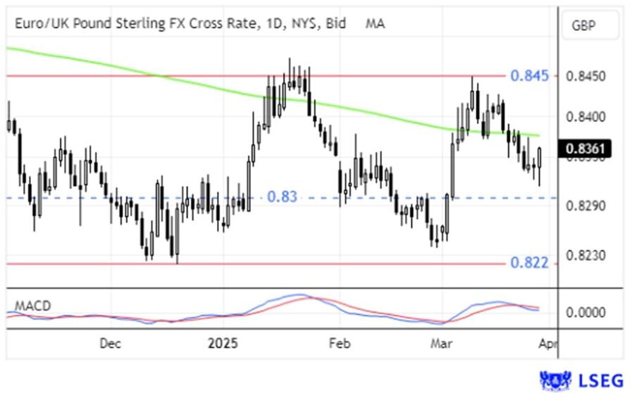 Ao longo da semana, o Eur/Gbp prolongou o sentimento de correção que advinha desde que falhou o teste à resistência das £0.845 a 11 de março. Deste modo, o Eur/Gbp continuou a perder terreno, ao ponto de renovar mínimos de mais de 3 semanas nas £0.8313, recuperando posteriormente para as £0.8350. O próximo suporte do Eur/Gbp está nas £0.83. O MACD apresenta um sinal de venda do par.