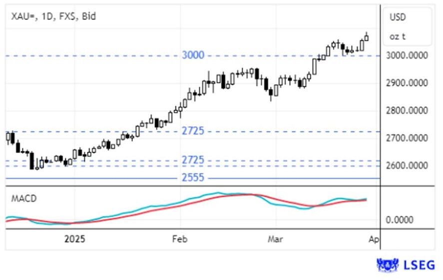 O ouro iniciou a semana estável, suportado pelo nível dos $3000/onça. No entanto, durante o resto da semana, o metal precioso voltou a ganhar terreno, ao ponto de renovar máximos históricos nos $3086/onça na sexta-feira.
