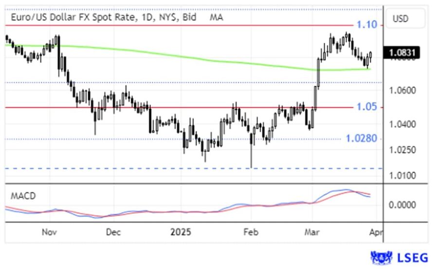 O Eur/Usd iniciou a semana a dar continuidade às perdas da semana anterior, numa correção após o teste à resistência dos $1.0950. Na quinta-feira de manhã, o Eur/Usd completou 6 sessões consecutivas de perdas, ao ponto de renovar mínimos 3 semanas nos $1.0731. Nos últimos dois dias da semana, o par recuperou até meados dos $1.0830. A sua média móvel a 200 dias cota perto dos $1.0726. O indicador MACD abriu sinal de venda.