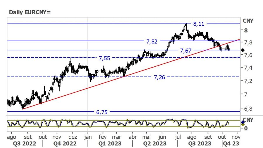 Após quebrar em baixa a linha de tendência ascendente (vermelho), em que transacionava desde agosto de 2022, o Eur/Cny encontrou suporte perto dos 7.67 yuans. Na última semana, o par valorizou nos primeiros dias, mas perdeu terreno nos remanescentes, retornando até tal suporte.