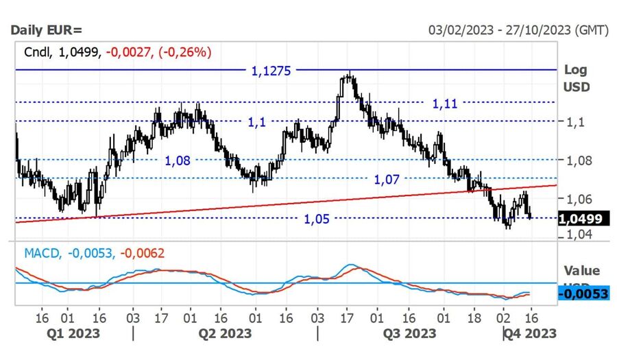No início da semana passada, o Eur/Usd recuperou terreno para perto dos $1.0650, mas, posteriormente, voltou a recuar e rondar o seu suporte presente nos $1.0500, enquanto o mercado utilizou o dólar como ativo de refúgio, devido ao aumento dos receios de um alastrar do conflito no Médio Oriente ao longo do fim de semana.