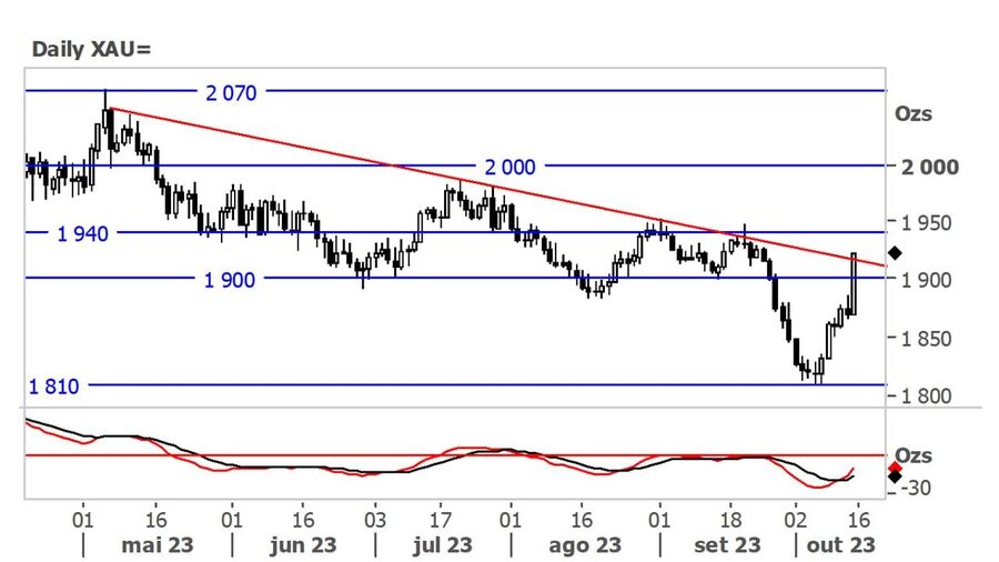 O ouro apresentou uma semana de recuperação, ao valorizar sucessivamente até quebrar em alta a resistência dos $1 900/onça e a linha de tendência descendente (vermelho) abaixo da qual transaciona desde maio do ano corrente.