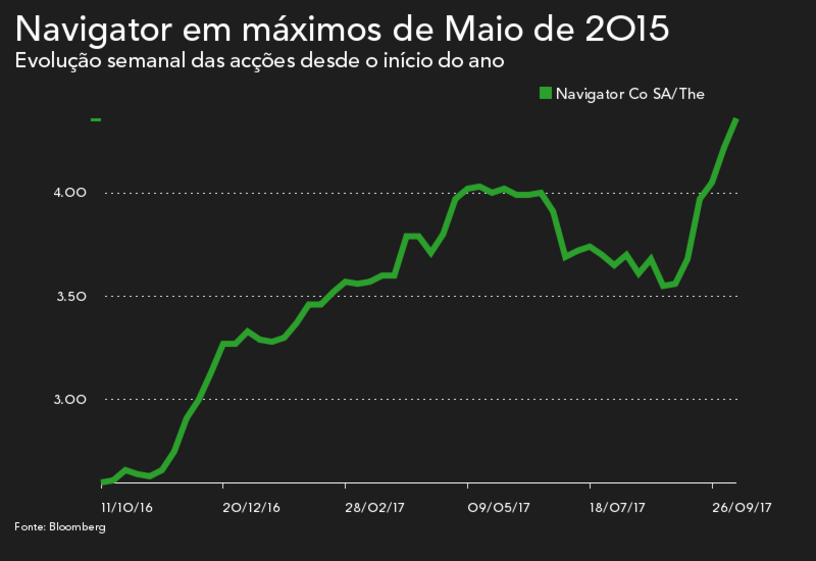 Mas este é um comportamento partilhado também pela Navigator, sendo uma evolução de sector. As acções da empresa liderada por Diogo da Silveira estão a subir 0,69% para 4,35 euros, tendo já negociado nos 4,379 euros, o que corresponde ao valor mais elevado desde Maio de 2015. As subidas recentes – desde 8 de Setembro que aprecia 22% - elevam para 37% o ganho desde o início do ano.