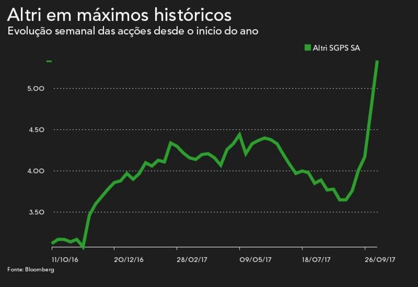 As acções da Altri estão a subir 0,96% para 5,351 euros, tendo já tocado nos 5,395 euros, o que representa o valor mais elevado de sempre da empresa co-liderada por Borges de Oliveira e por Paulo Fernandes (que também é líder da Cofina – dona do Jornal de Negócios).