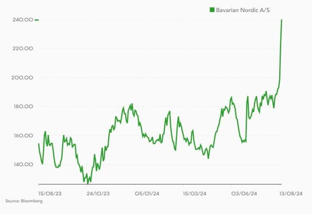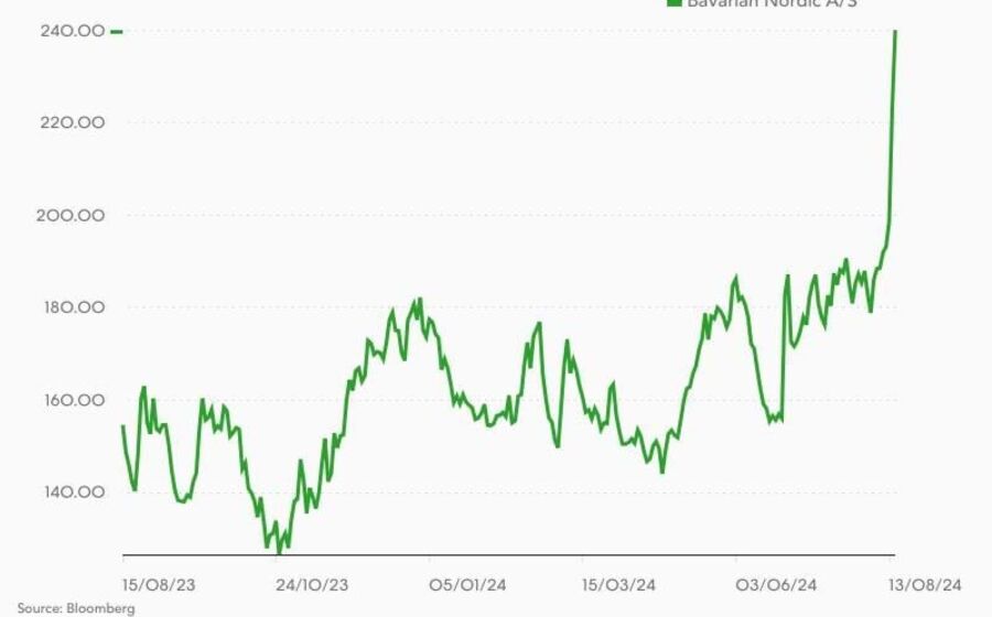 As ações da empresa dinamarquesa chegaram a disparar 17% no início das negociações de quinta-feira em Copenhaga, prolongando uma subida de 12% no dia anterior. Os títulos da Bavarian Nordic cotados nos EUA fecharam a última sessão em Wall Street a ganhar 33%.