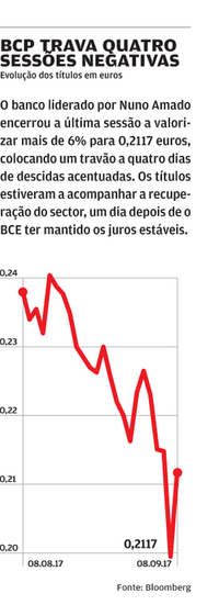 O banco liderado por Nuno Amado valorizou 6,12% para 0,2117 euros, a acompanhar o comportamento positivo registado pelo sector, que terminou o dia a avançar 0,85%. "Após o discurso de Mario Draghi [na última quinta-feira], que deu sinais sobre a manutenção de juros em níveis historicamente baixos por mais algum tempo, a banca europeia entrou em quedas e o BCP acelerou as perdas em linha com o restante sector", realça Gualter Pacheco.