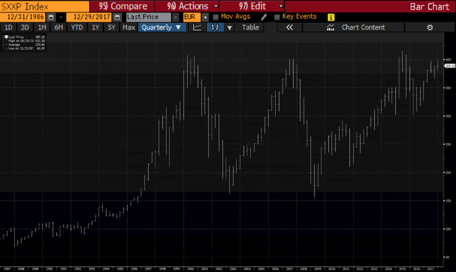O Stoxx600 fechou hoje a 0,19% para 399,8 pontos, acumulando uma valorização de 2,73% em 2018. Para atingir máximos históricos, terá que subir 3,85% face aos níveis actuais. Em 2017 o índice avançou mais de 7%, depois de em 2016 ter colocado ponto final numa série de quatro anos a ganhar.