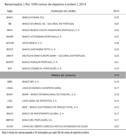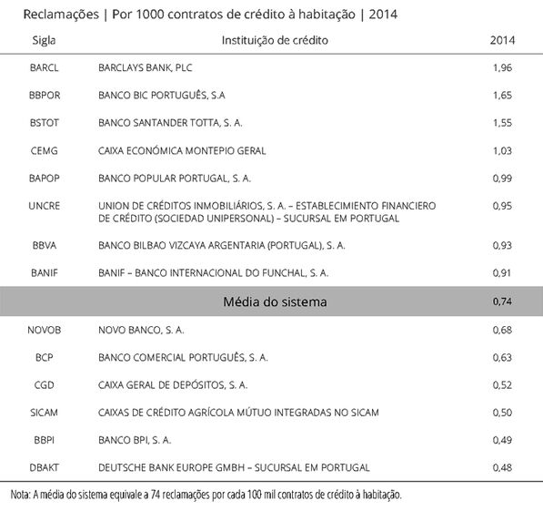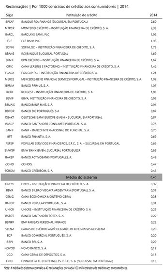 O Barclays continua a ser o banco com actividade em Portugal que foi alvo de mais queixas por parte dos clientes no crédito à habitação e nas contas de depósito, em 20143. Já a financeira da Peugeot para crédito automóvel liderou as reclamações no crédito ao consumo. No total, os portugueses fizeram 14.157 reclamações no último ano, menos 21% que em 2013.