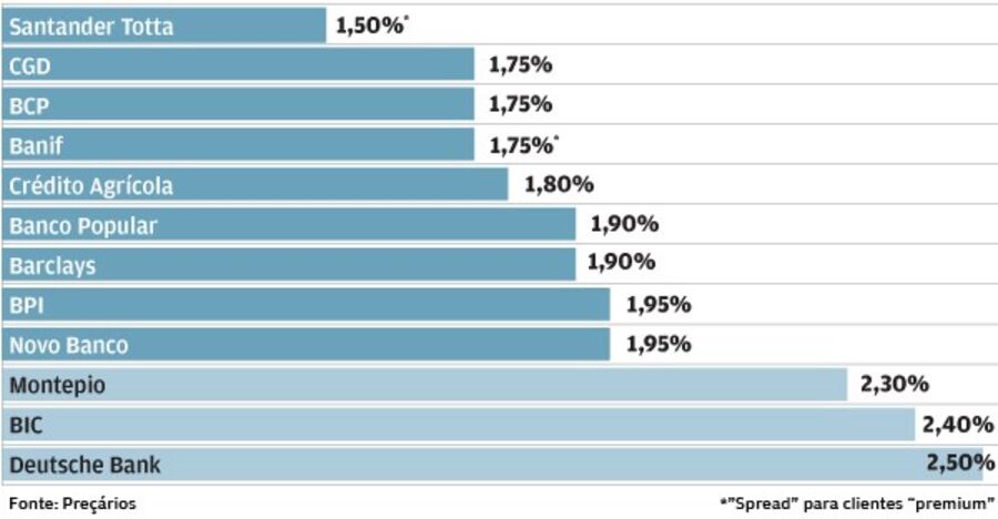 Além de as taxas de juro no mercado estarem a diminuir, o que implica uma redução dos encargos nos créditos já existentes, as novas operações têm sido alvo de taxas mais baixas. Em Fevereiro deste ano, os bancos deram início a um movimento de cortes sucessivos nos "spreads" mínimos do crédito à habitação. Num conjunto de doze instituições, oito têm margens mínimas abaixo de 2%. CGD, BCP E Santander Totta têm o "spread" mínimo mais baixo: 1,75%. Mas os clientes "premium" podem conseguir uma margem de 1,5% no banco liderado por António Vieira Monteiro ou de 1,75% no Banif.