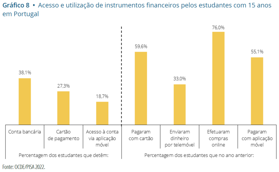 “A avaliação da literacia financeira dos jovens assume particular relevância num contexto em que uma proporção significativa dos estudantes já tem acesso e utiliza instrumentos financeiros no seu quotidiano”, adverte ainda. De acordo com o módulo de literacia financeira do PISA, 38,1% dos jovens de 15 anos em Portugal detém uma conta bancária, 27,3% possui um cartão de pagamento e 18,7% utiliza uma aplicação financeira no telemóvel.