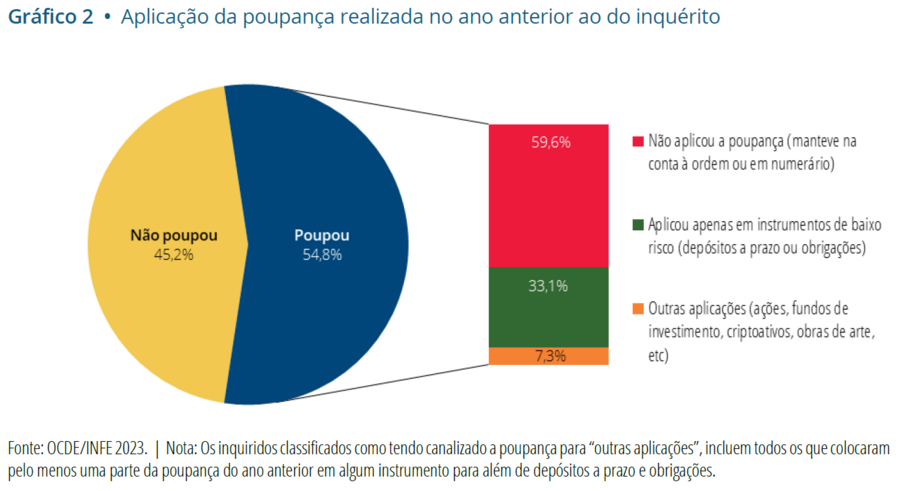 Estes indicam que apenas 54,8% dos inquiridos refere ter poupado no ano anterior ao do inquérito e, entre os que pouparam, uma maioria significativa (59,6%) optou por mantê-la na conta à ordem ou em numerário, abdicando de qualquer retorno financeiro. A aplicação da poupança em instrumentos financeiros é predominantemente realizada através de produtos de baixo risco, como depósitos a prazo ou obrigações, que abrangem 33,1% dos inquiridos que pouparam. Em contraste, a utilização de instrumentos financeiros mais complexos, com maior potencial de retorno e maior risco, como ações ou fundos de investimento, é residual (7,3%).