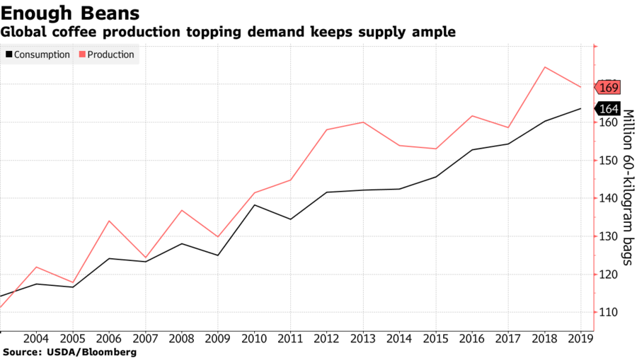 Os preços do café arábica, a variedade suave preferida por empresas como a Starbucks, acumulam uma queda de quase 10% em 12 meses e, em maio, atingiram o nível mais baixo desde 2005. Na semana passada, a Organização Internacional do Café elevou a previsão de excedente para o mercado global, que também inclui o café robusta. Na quarta-feira, a Olam International, uma das maiores traders de café da Ásia, culpou os preços mais baixos do café e vendas mais baixas pela queda na receita da unidade onde o café se engloba.