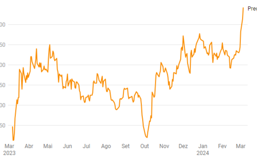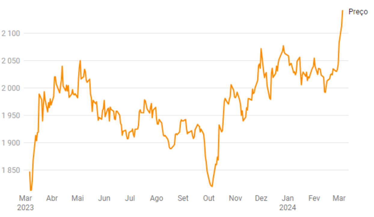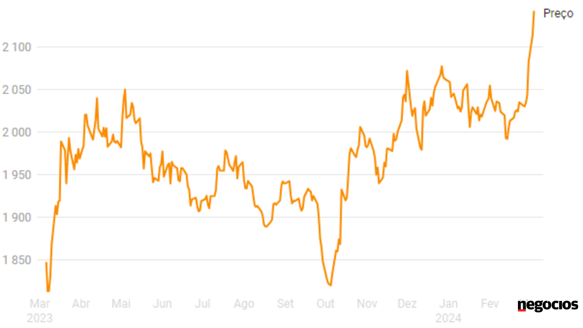 Os preços do ouro seguem a valorizar pela quinta sessão consecutiva, tendo batido o anterior máximo histórico de 2.135,40 dólares por onça, registado a 4 de dezembro do ano passado. O metal precioso aprecia-se ao início da tarde 1,3% para 2.141,79 dólares por onça.