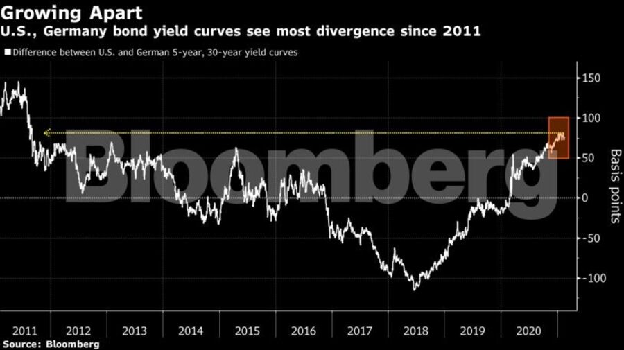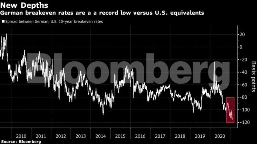 O barómetro da dívida para a inflação futura na Alemanha está em mínimos históricos face ao seu congénere nos EUA. A diferença entre as taxas de juro da dívida soberana dos EUA e da Alemanha apresentam o maior diferencial em cerca de uma década. As empresas de pequena capitalização no continente europeu associadas ao ciclo económico estão muito aquém do rally dos índices de referência dos EUA.