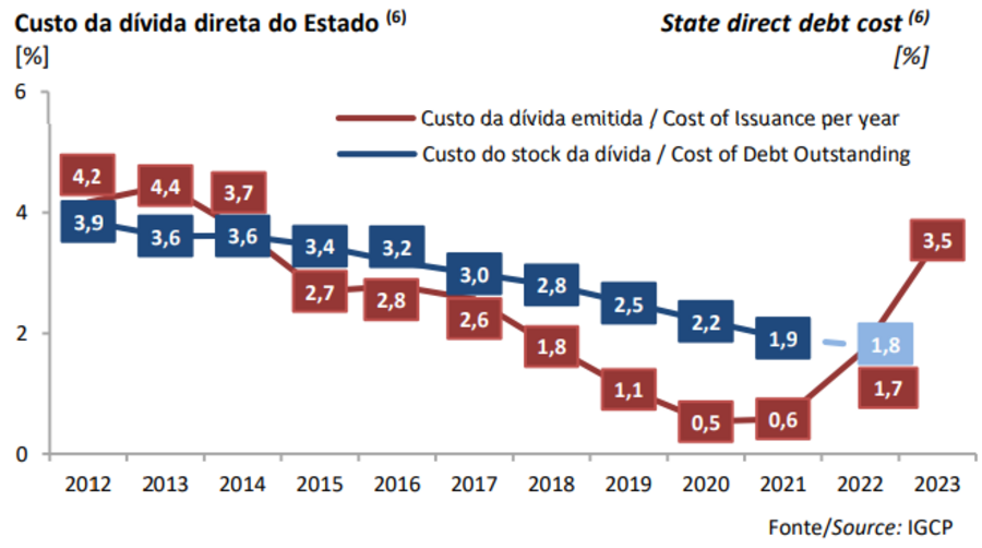 As obrigações que o país coloca no mercado têm tido juros mais elevados desde 2020. Ainda assim, o custo do total do "stock" alivia há uma década.