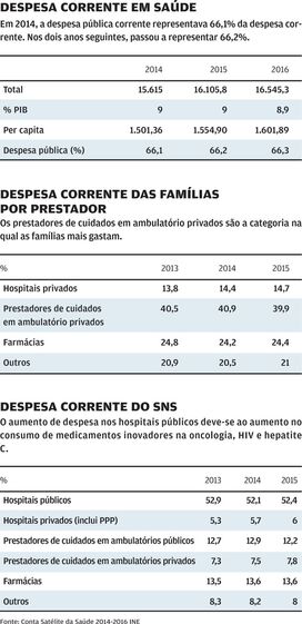 A saúde prevê em 2018 gastar 10.289,5 milhões de euros, o que corresponde a um aumento de 2,4% (239,1 milhões de euros) face ao estimado para 2017. As entidades do SNS são responsáveis pela maioria da despesa, estimando-se em cerca de 9.407,5 milhões de euros (91,6% do total) a despesa para 2018 (valores consolidados). A aquisição de bens e serviços, com um peso de 55,3%, inclui as compras de medicamentos e os meios complementares de diagnóstico e terapêutica, bem como os encargos com as parcerias público-privadas. As despesas com pessoal representam cerca de 38,4% do total da despesa consolidada, ascendendo a 3.951,2 milhões de euros.
