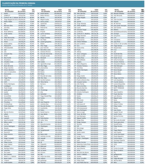 André Duarte concentrou os esforços nos mercados norte-americanos, especialmente nas empresas do sector tecnológico. O Nasdaq foi o índice eleito. E se por cá se fizeram algumas fortunas virtuais com a descida do PSI-20, o engenheiro de "software" bateu a concorrência com apostas na descida do índice tecnológico que neste período recuou 4,29%. Foi, assim, o grande vencedor da semana, a primeira da competição, acumulando uma valorização de 118,5% na carteira de 100 mil euros virtuais.