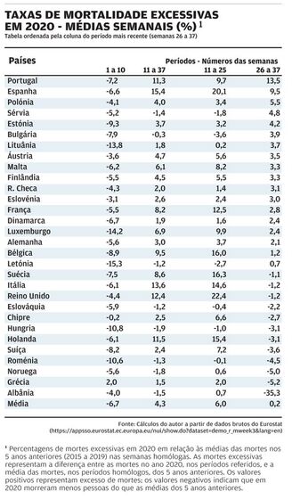 A tabela, que elaborei, a partir de dados brutos do Eurostat, fala por si, permitindo comparar as prestações dos sistemas de saúde dos países europeus desde a semana 11 (início das mortes excessivas em Portugal) e a semana 37 (última semana para a qual existem dados comparáveis).