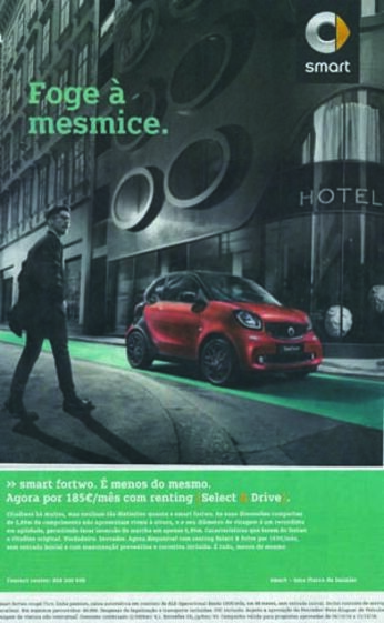 Muito bom é também o slogan de assinatura do Smart Fortwo. Em vez de dizer ao observador para ser e escolher diferente, optou pela negação do seu contrário: "Foge à mesmice." Curto, incisivo, usando uma palavra fantástica - mesmice - e rara no jornalismo, quanto mais na publicidade. O texto explicativo volta a negar o contrário reinventando uma expressão comum: em vez de ordenar ao observador que rejeite mais do mesmo, diz-lhe que o carro anunciado "é menos do mesmo." A foto a preto e branco com o carro vermelho acentua a diferença, embora repetindo técnicas habituais da comunicação: o vermelho é paixão, o preto e branco é distinção (o anúncio até o sugere, dizendo que o carro é "distintivo"). Um jovem fashion, cliente-alvo, aproxima-se do carro, que está à porta de um hotel. É de noite, e a noite espera-o. A imagem é eficaz e corresponde à mensagem, embora sem inovação. Mas o slogan e o texto são inovadores neste anúncio que pretende apresentar o produto como "o citadino original. Verdadeiro. Inovador." Os publicitários fugiram da mesmice da publicidade.