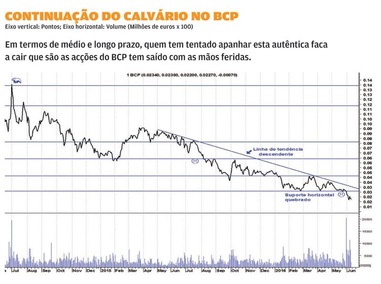 O que me fará ficar optimista em termos de médio e longo prazo no BCP não serão declarações de Nuno Amado, números do banco ou indicadores económicos portugueses. Será sempre o gráfico e quando o BCP quebrar resistências importantes aí algo terá mudado neste longo e penoso "Bear Market". É verdade que, ao longo destes anos, alguns conseguiram aproveitar ressaltos fortes que o BCP teve. Ainda na semana passada, numa das sessões, a acção registou a maior subida do último ano. Mas, em termos de médio e longo prazo, quem tem tentado apanhar esta autêntica faca a cair tem saído com as mãos feridas. E, na maior parte das vezes, acabam por manter a acção com a convicção de que já está demasiado baixa para cair mais. E o calvário continua.