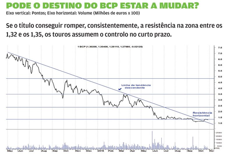 Tenho estado pessimista, há muito tempo, em relação ao BCP mas a acção pode estar quase a dar o primeiro sinal de força no curto prazo. Se o título conseguir romper, consistentemente, a resistência na zona entre os 1,32 e os 1,35, os touros assumem o controlo no curto prazo, abrindo espaço à acção para subir nesse horizonte temporal.