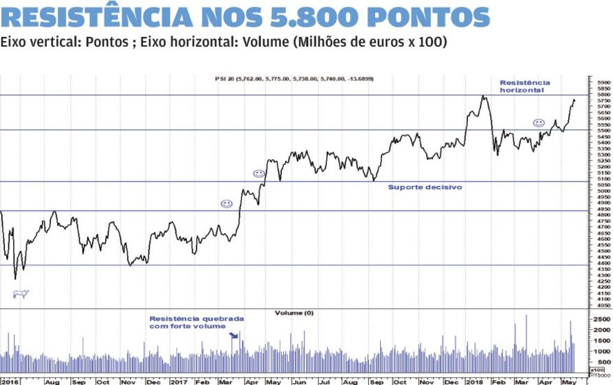 Se dúvidas havia sobre a quebra da resistência dos 5.500 pontos, esta semana elas dissiparam-se. Os sinais de força multiplicam-se, algumas acções estão em máximos históricos e os touros dominam em todos os horizontes temporais. No curto prazo, estas subidas fortes levaram o PSI a estar em "sobrecompra" o que, aliado à proximidade da resistência na zona dos 5.800 pontos (máximo dos últimos três anos), faz com que aumente a probabilidade de uma correcção ou consolidação no curto prazo que permita aliviar os indicadores antes de abrir espaço para voos bem mais altos.