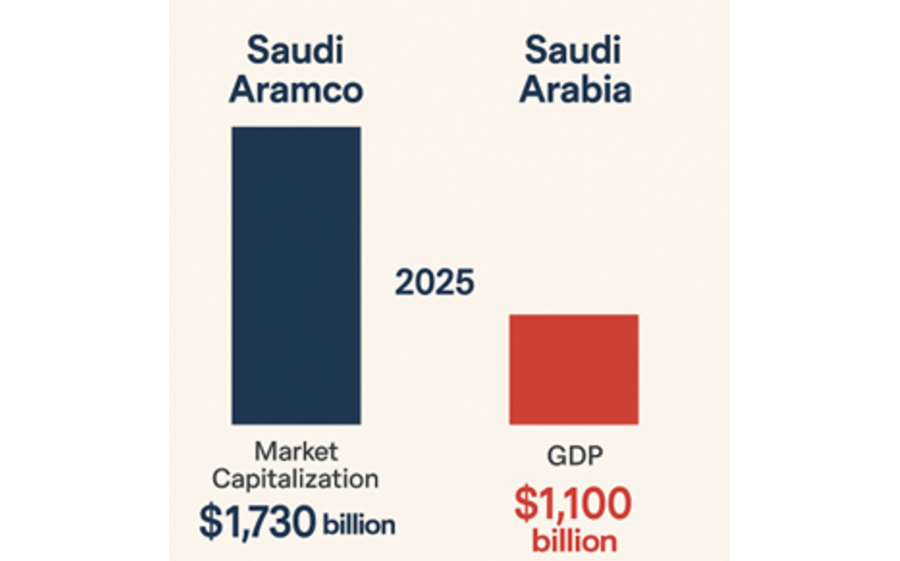 Um exemplo particularmente revelador é o da Saudi Aramco, que em 2025 atingiu uma capitalização bolsista de 1,73 biliões de dólares, superando o PIB da Arábia Saudita, estimado em cerca de 1,1 biliões. Ou seja, o mercado atribui à empresa um valor superior ao da produção económica anual total do país que a detém. Enquanto gigante do setor energético, a Aramco desempenha um papel crucial nos desafios da transição energética. As suas decisões podem acelerar (ou travar) a transição dos combustíveis fósseis para as energias renováveis. Sendo uma das empresas com maior impacto ambiental no mundo, a sua responsabilidade climática é inegável no caminho para o desenvolvimento sustentável global.