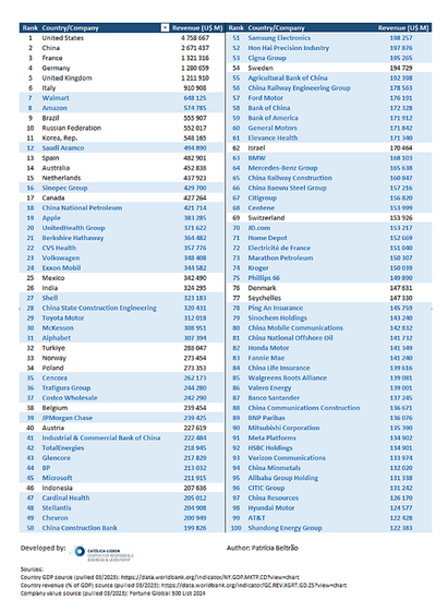Uma forma simbólica — e poderosa — de ilustrar o peso económico das grandes empresas no panorama global é comparar países e empresas com base nas suas receitas anuais. Em 2016, segundo um estudo da ONG Global Justice Now, 69 das 100 maiores “economias” do mundo eram empresas e apenas 31 eram países. Numa avaliação mais recente, realizada em março de 2025 pelo Center for Responsible Business and Leadership (CRBL), identificou-se um padrão semelhante. Curiosamente, os valores revelaram-se ainda mais expressivos: entre as 100 entidades com maior receita anual no mundo, 74 são empresas e apenas 26 são países.