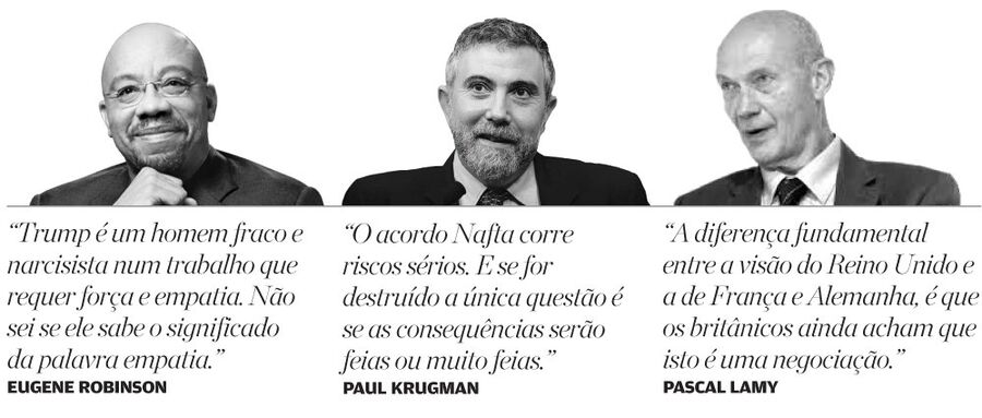 No New York Times, Paul Krugman fala das negociações dos acordos comerciais Nafta: "Abdicar do Nafta seria terrível para o México e mau para os EUA. Seria péssimo para os maiores interesses empresariais americanos, que gastaram duas décadas a construir as suas estratégias competitivas à volta de um mercado do Norte da América integrado. Pode ser bom para o frágil ego de Trump. Mas isso é uma razão para recear o pior. O Nafta corre riscos sérios. E se for destruído a única questão é se as consequências serão feias ou muito feias." A propósito de negociações, Pascal Lamy, antigo comissário europeu, diz ao Financial Times: "A diferença fundamental entre a visão do Reino Unido e a de França e Alemanha, é que os britânicos ainda acham que isto é uma negociação. Não é uma negociação, é um processo gerido para minimizar os danos. Eles parecem acreditar que podem comprar algo com o dinheiro que têm de pagar." Os dados estão na mesa.