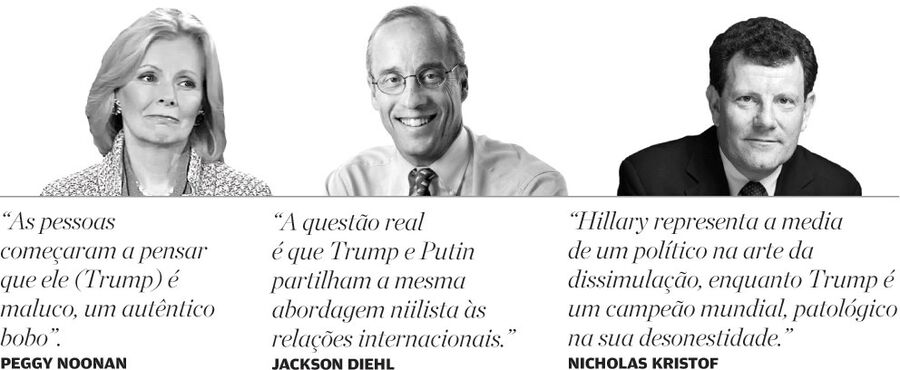 Entretanto o nervosismo cresce no sector republicano. Peggy Noonan, uma antiga autora dos discursos de Reagan, deixou o seu lamento no "Wall Street Journal": "Quando actuas como se fosses louco, as pessoas começam a pensar que és louco. Foi o que aconteceu esta semana. As pessoas começaram a pensar que ele (Trump) é maluco, um autêntico bobo". Se juntarmos isso ao que tem escrito Karl Rove, um dos principais estrategas republicanos, não admira que estes estejam à beira de um ataque de nervos.