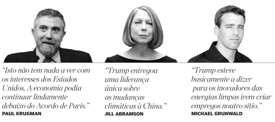 As reacções são variadas e as ilações sobre a decisão também. No "Politico/Europe", Michael Grunwald escreve: "A decisão de Donald Trump de se retirar do Acordo de Paris não teve a ver, na realidade, com o clima. E apesar da sua retórica sobre as amarras 'draconianas' que o acordo imporia à economia americana, a decisão de Trump não foi também por causa disso. Os compromissos da América com o Acordo de Paris, como os de outras 194 nações, foram voluntários. (…) Não, a saída abrupta de Trump deste cuidadosamente desenhado acordo multilateral foi uma chapada diplomática e política: foi sobre estender o dedo do meio ao mundo". Mais: "Trump esteve basicamente a dizer para os inovadores das energias limpas irem criar empregos noutro sítio".