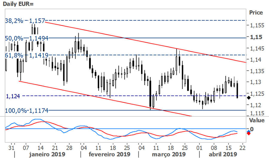 O Eur/Usd afastou em baixa os $1.13 no final da última semana, encurtada pelo feriado de sexta-feira, pressionado por alguns dados macroeconómicos na Zona Euro e nos EUA. O PMI industrial na Alemanha contribuiu inicialmente para este recuo, tendo feito o par recuar dos $1.13 para os $1.1270. Posteriormente, foram anunciados os PMIs da Zona Euro, que saíram todos abaixo do esperado, intensificando o pessimismo sobre a economia do bloco e levando o Eur/Usd a alcançar níveis em torno dos $.1240. Por outro lado, nos EUA as vendas a retalho acabaram por serem mais otimistas do que se previa e o par acabou por renovar mínimos de uma semana tendo atingido níveis próximos a $1.1230.