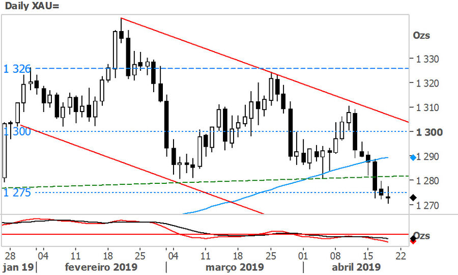 A nível técnico, o ouro intensificou a perspetiva bearish. Contudo, negoceia em oversold e aparenta ter encontrado algum suporte na zona dos $1275. Insere-se a possibilidade uma correção em alta, antes de dar continuidade às recentes quedas.