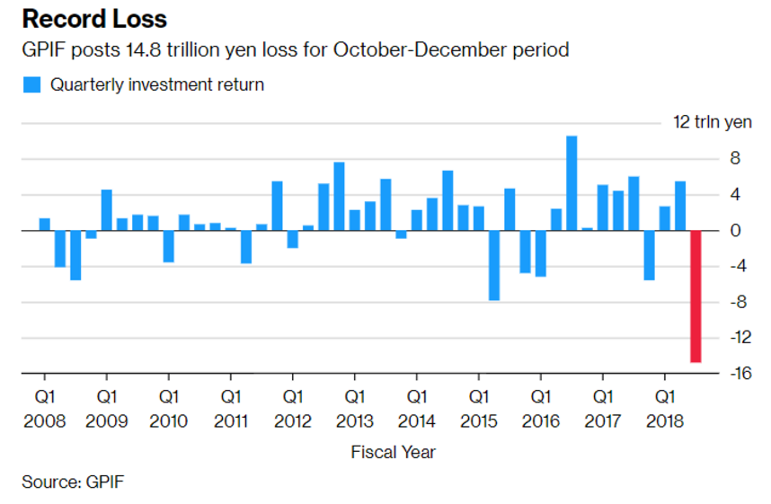 O fundo de pensões do governo do Japão (Government Pension Investment Fund - GPIF) gerou um retorno negativo de 9,1% nos últimos três meses do ano passado, o que equivale a uma perda de 14,8 biliões de ienes (118,5 mil milhões de euros).