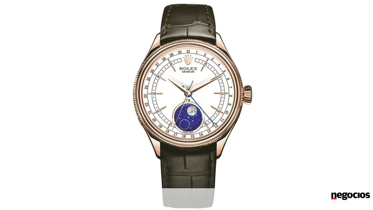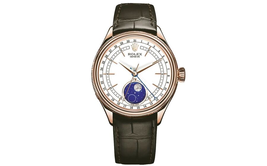 Este Cellini Moonphase tem também uma visualização da data por um ponteiro central, rematado por um quarto crescente que indica o calendário sobre o contorno do mostrador. Este novo modelo é alimentado por um movimento mecânico de corda automática inteiramente manufacturado pela Rolex e surge com uma pulseira em couro de aligátor castanha, com fecho Crownciasp desdobrável em ouro Everose 18 quilates, o que é uma novidade para um modelo Cellini.