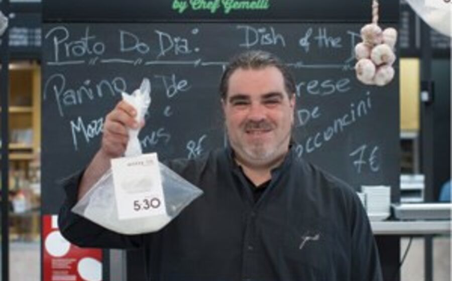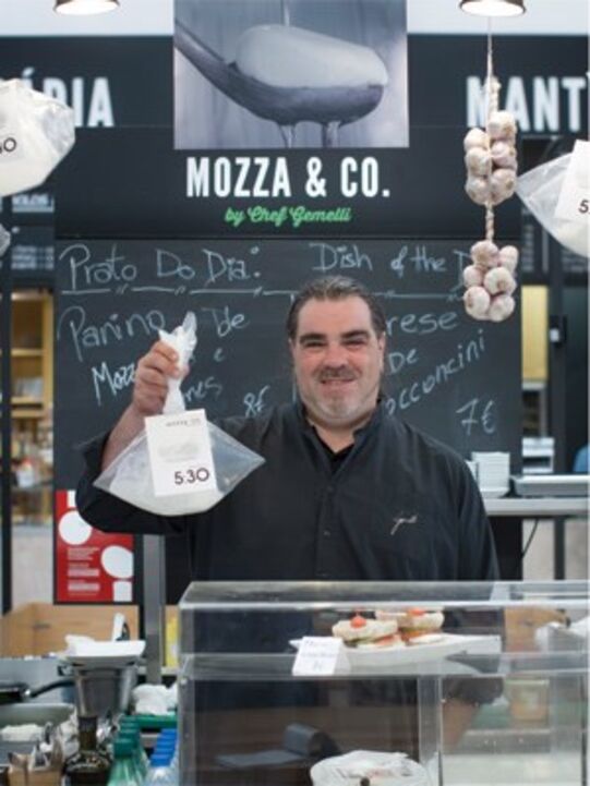 Augusto Gemelli vende mozzarella e burrata de leite de búfala no Mercado da Ribeira. Podemos saborear os queijos que chegam todos os dias de Nápoles em saladas ou levá-los para casa e surpreender os amigos.